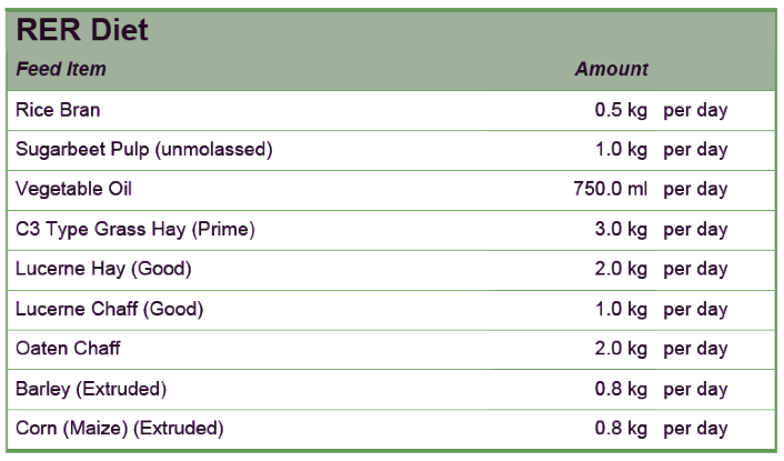 Current recommendations suggest that horses with PSSM should receive 13% or more of their daily digestible energy intake as oil, while horses with RER on high energy diets (for example thoroughbreds in race training) should be receiving 20 to 25% of their daily digestible energy intake as oil or high fat feeds like rice bran. With these very high levels of oil, care must be taken to introduce it to the diet gradually to allow time for the horse and its gut to adapt to that level of oil feeding.