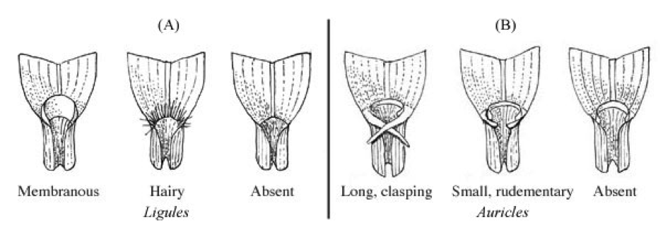Ligules are located at the junction of the leaf blade and leaf sheath (see photo above) and can either be membranous (something like opaque cling-wrap), hairy structures or simply absent. Auricles are extensions of the collar that is also located at the junction of the leaf blade and leaf sheath. Auricles can either be long and clasping, small and rudimentary or absent. The various ligule and auricle structures can be seen below.