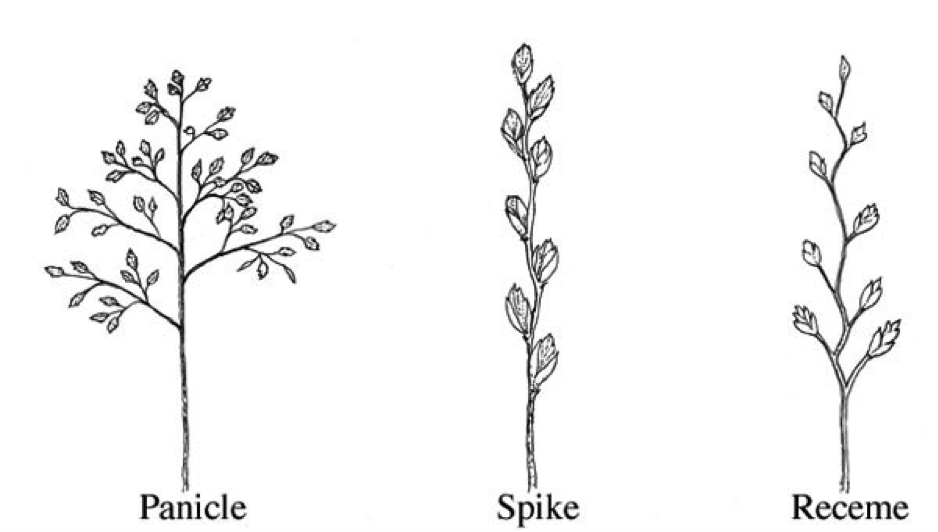 The easiest way to identify certain plants is by finding their seed heads as grasses tend to have distinctive seed heads. Seed heads can either be in the form of a panicle, spike or receme (see below).