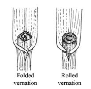 The first thing to look at with leaves is how the very youngest leaves are packaged within the shoot (called their ‘vernation’). Leaves can either be folded, appearing V-shaped in the shoot or rolled and appearing rolled in the shoot. The diagram shows both structures.