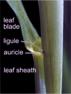 If seed heads are not present, you will need to use the structure of the leaf, auricle and ligule to identify your plants. These areas of the plant are shown in the photograph here.