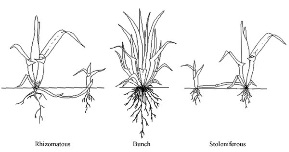 The final piece of the puzzle is to look at how the plant actually grows. Does it grow in a clump or bunch? Does it send out underground runners called rhizomes to establish new plants or does it use above ground stolons to establish new plants. These 3 growth habits are shown below.