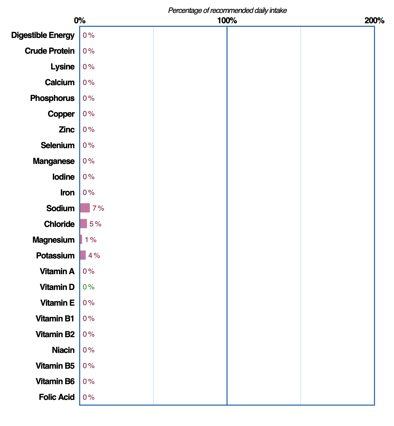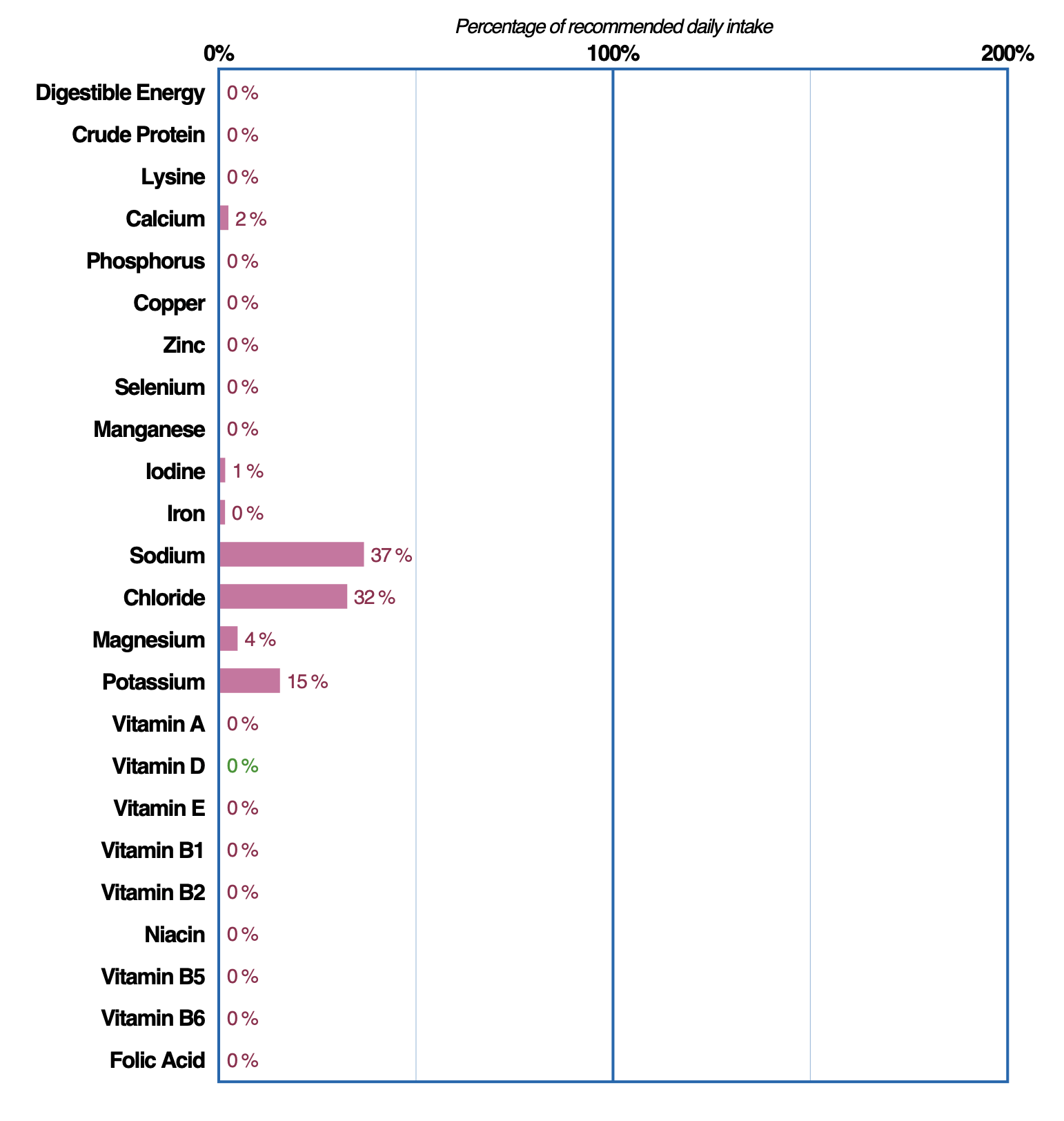 If you put one of these high-quality products into FeedXL, for a 450 kg (990 lb) horse in very heavy work, at a dose of 60 grams per day, this is how it should look (with JUST it in the diet):