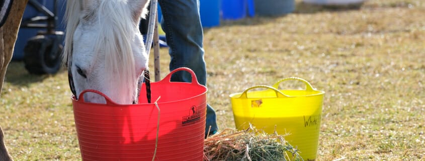 - Then, feed your ‘grain’. If your horse is happy to eat it, feed your horse’s normal grain between the loops, but keep the amount to 500 – 700 grams (for a 450 kg/990 lb horse). Don’t let them have more grain than this per loop.