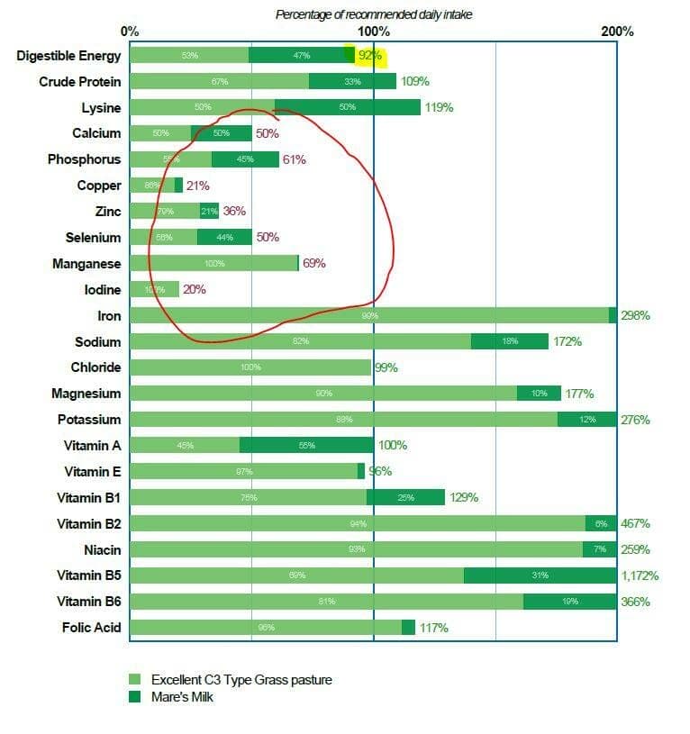 Pasture + Milk – note now the deficit in digestible energy has been filled by the wonderful milk, so he doesn’t actually need extra calories in the diet. But there remain many mineral deficits. This is what you need to top up.
