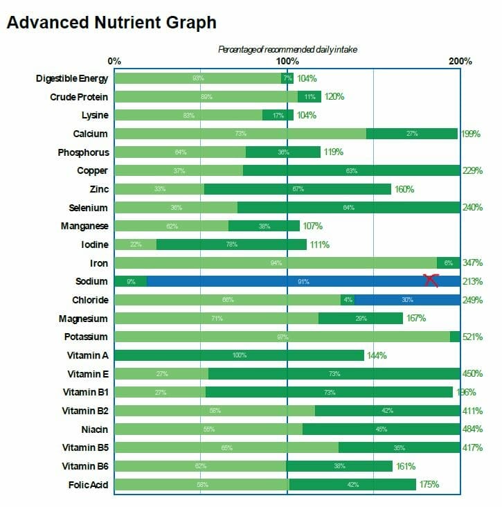 Take this horse’s diet for example, shown in the graph below. If we add 10g/100kg of bodyweight to his diet, his sodium intake is well over 200% of what he needs. In extreme heat conditions, this may well be accurate, but once it cools off, this is way more sodium than he needs.