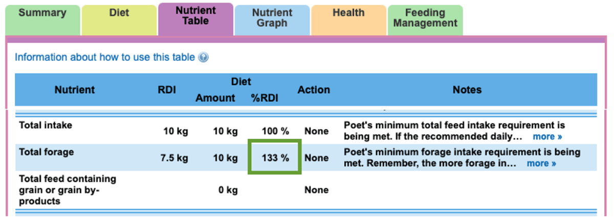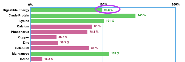 If it is at 100% or above (extra stars for above!), look at your horse’s nutrient graph, looking specifically at the Digestible energy level. Is it between 90 and 100%?