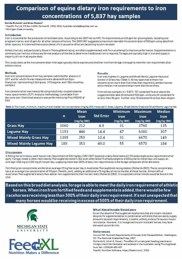 A 500 kg horse in heavy work has an iron requirement of 500 mg/day (NRC 2007; based on a daily feed intake of 2.5% bodyweight and a requirement of 40 ppm). Forage intake is often restricted by Thoroughbred trainers. But even when fed at 1% of bodyweight to a 500 kg horse, these hays will supply an average 1,060 mg to 2,230 mg of iron per day, supplying more than 200% of daily iron requirements in the forage component of the diet alone.