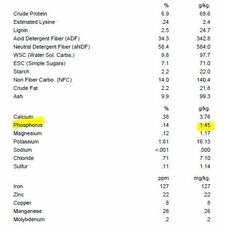 The analysis below shows the analysis result numbers a pasture, but they are kind of meaningless unless we look at them in terms of how much of that pasture a horse eats and how much nutrient is provided compared to the amount of nutrient the horse actually needs.
