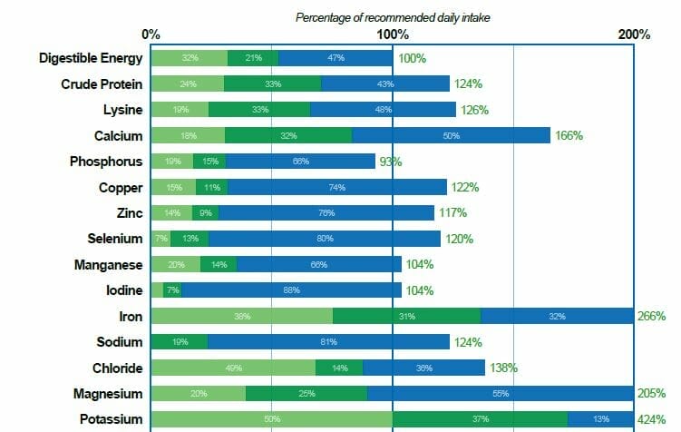 The second bar graph with the green and blue bars shows a diet for a late pregnant mare on this pasture. The diet uses 2 kg of prime lucerne hay (shown in the darker green) and 3 kg of a commercial broodmare feed (shown in the blue). All requirements are now nicely met!