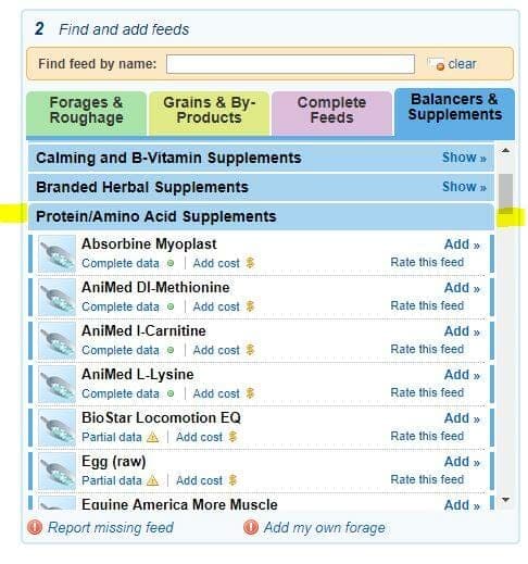 There are also of course BCAA supplements available (for humans and horses) that can be used. You should be able to find information on these in FeedXL, in the Blue ‘Supplements’ tab, under ‘Protein & Amino Acid Supplements’.