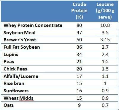 Other common feedstuffs and their protein and leucine content are shown in the table below.