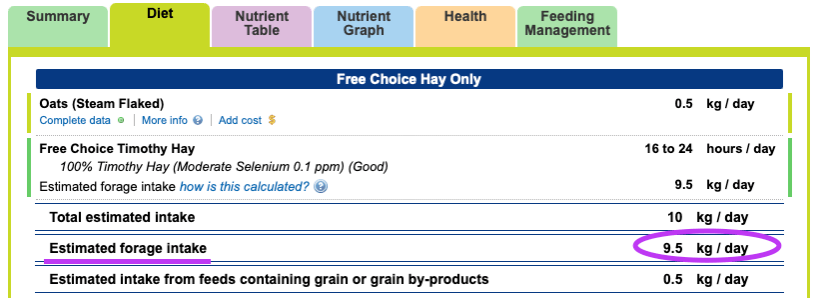 The more forage you can get into your horse’s diet, the better! So here is a tip… in FeedXL, enter all of your horse’s forages, pasture, hay, chaff, forage cubes or pellets, haylage… anything that is considered forage! Then go to the results and look at your horse’s ‘Total Daily Feed Intake’ amounts. Is it at 100%? Or is it less than 100%?